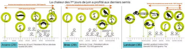 En avril, les épandages de matières organiques sont suivis d’un enfouissement, qui « agit comme un déchaumage, ou plutôt comme un faux semis ». Les semis de maïs ont été réalisés autour du 4 mai, à 5 cm de profondeur pour être à l’abri des attaques des choucas des tours, des pigeons et des passages de houe rotative. Cet outil est passé sur la parcelle au 15 mai, suite à un épisode pluvieux de 40 mm (voir encadré). Par la suite, les cultures ont été nettoyées par l’application d’herbicides au stade 4 feuilles du maïs, à un moment ou le maximum d’adventices sont levées. La bineuse terminera si nécessaire ce programme de désherbage.