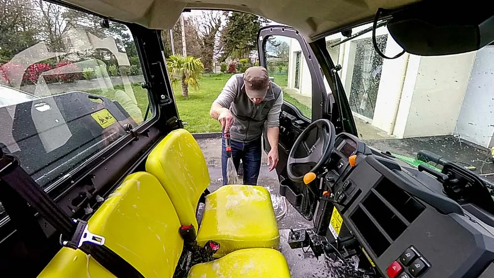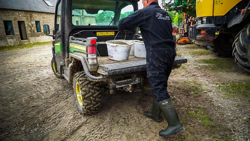 Le XUV865M, équipé d’une lame à l’avant, a d’abord effectué son rodage dans la ferme d’Alexis et Solène Legros, éleveurs à Saint-Trimoël (22). Dans cette ferme porcine et laitière en traite robotisée, le Gator a rapidement remplacé la chargeuse sur pneus pour repousser l’aliment à l’auge. « Cela évite de découpler le godet mélangeur pour atteler la lame ; le gain de temps est appréciable », remarque Alexis Legros. « On gagne en confort et en fatigue, les sièges du transporteur sont à hauteur d’homme. Il n’y a pas d’échelle, il faut juste ouvrir la porte et s’asseoir ». En mars, lorsque l’essai a débuté, les températures étaient encore basses. L’éleveur, également utilisateur d’un quad, a apprécié la cabine chauffée. « Il y a également un confort au champ avec des suspensions incroyables. À 30 km/h dans une parcelle, on ne sent rien. » Autre usage atypique, l’éleveur a raccordé directement un semoir à batterie pour ensemencer un hectare en phacélie.
