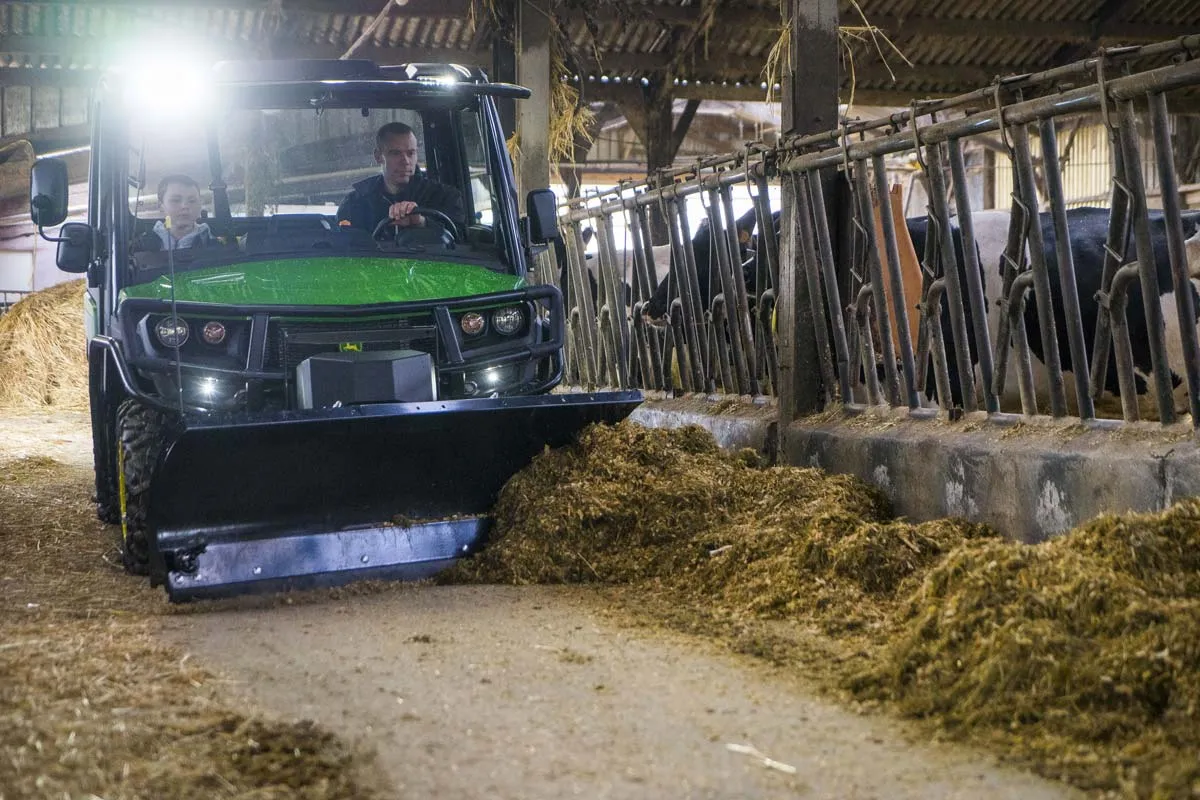 Dans la ferme voisine de Philippe et Fabienne Blanchard, l’usage a été quelque peu différent. Ici, les éleveurs ont mis de côté la lame. Les 50 Montbéliardes sont au champ à cette période de l’année. L’éleveur a surtout pu profité du confort général du SSV pour traverser les pâtures et repousser les fils de clôture. « Je ne savais pas vraiment quelle utilité nous allions avoir de cet engin sur la ferme, mais il a rapidement trouvé sa place et remplacé le Peugeot Partner vieillissant et peu adapté à la conduite hors du réseau routier », fait observer l’éleveur qui apprécie également le chargement arrière à hauteur d’homme pour transporter des seaux d’aliment aux génisses. « Les parcelles sont presque toutes attenantes à la ferme. Cet utilitaire est idéal pour les petits trajets. Il démarre rapidement et on part à froid. La capacité de chargement de 500 kg permet de ne pas se soucier de ce que l’on met dans la benne. Le moteur n’est pas en reste et nous avons même pu sortir un voisin bloqué dans la boue avec sa camionnette. Les 4 roues motrices, couplées à un poids d’une tonne, collent le Gator au sol. »