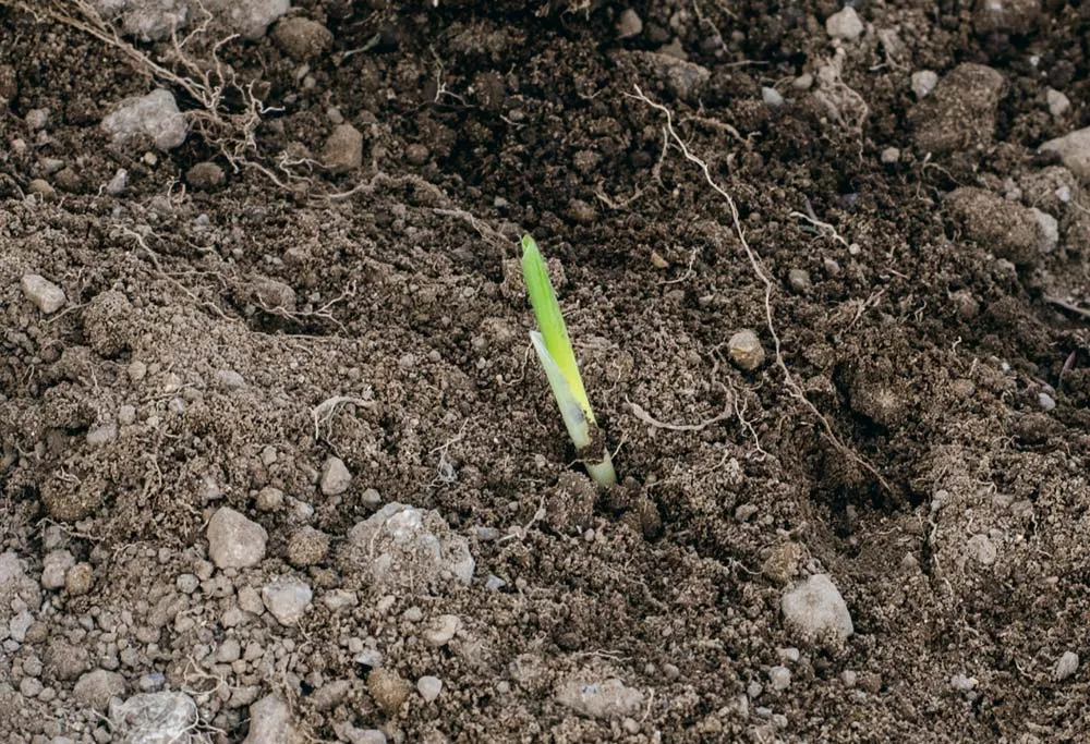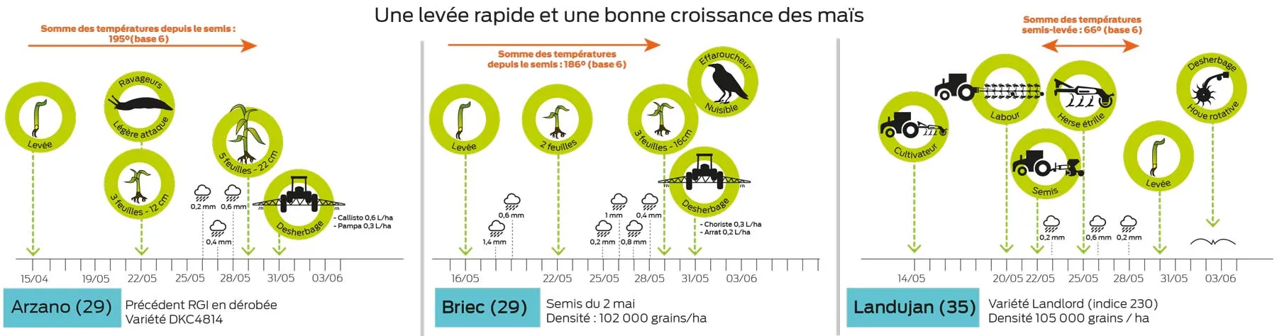 Cette parcelle a été semée jeudi 16 mai. Aussitôt a suivi un passage de herse étrille à l’aveugle. « Cela nivelle le sol et l’émiette, limite les adventices qui peuvent se développer dans le sillon, nettoie les résidus en surface comme un morceau de racine ou une touffe de ray-grass et brouille les repères des corbeaux. » En balayant le sol doucement, couche après couche, d’un revers du bras, jusqu’à la profondeur du semis (environ 4 cm), Georges Maillard du Gab d’Armor cherche des adventices au stade filament. « Plus que le stade du maïs, c’est leur présence dans la terre qui doit déclencher un désherbage mécanique. » Il constate aussi des grains de maïs présentant un germe d’1 cm. Dans une semaine, on apercevra des points verts sortis de terre. À partir de ce stade « pointant », la herse étrille doit être laissée au hangar : « On risquerait trop de casse sur la culture. »