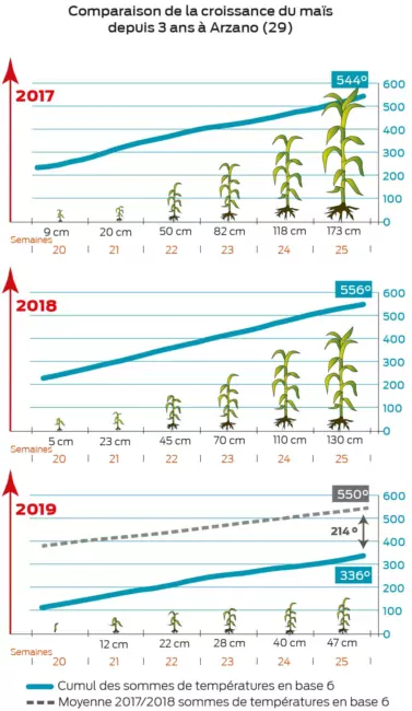 Il en ressort que l’avoine s’est développée plus vite que le triticale. « Il était à 4-5 cm avant que le maïs ne lève », relève Gildas David. Et ce, quelle que soit la profondeur ou la densité du semis. Un atout pour le choix de cette espèce : quand elle s’installe vite, elle développe rapidement ses racines qui, en dégageant du C02, attirent les larves de taupins. « L’absence de rappuyage au semis explique peut-être le retard pour le triticale », analyse l’agriculteur. Actuellement, la notation de la parcelle de maïs, avec un précédent prairie depuis 4 ans, a mis en évidence une attaque de 20 % des plants. Reste à voir, dans 10 jours, la seconde notation et l’incidence du désherbage.