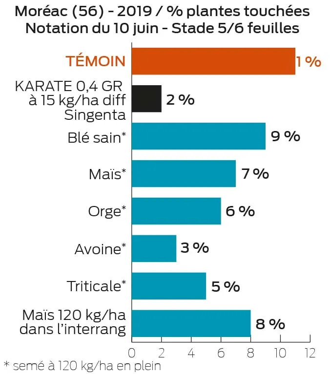Vu que le piégeage de masse des adultes ne réduit pas la pression les années suivantes, avec les solutions qui s’amenuisent face à ce ravageur, « la technique qui se distingue le mieux dans les essais menés depuis plusieurs années reste celle des appâts », précise Éric Masson, lors de la journée Circuit vert d’Arvalis, à Bignan (56), le 14 mai. Des essais sur cette campagne à Moréac (56) montrent que pour une parcelle attaquée à 11 %, si la solution chimique avec du Karaté 0,4 GR permet de limiter l’attaque à 2 % (voir graphique), les plantes-appâts réduisent le risque et varient entre 3 et 9 % d’attaque. Les essais sont menés avec des céréales semées en plein, à détruire chimiquement au stade 2-3 feuilles.