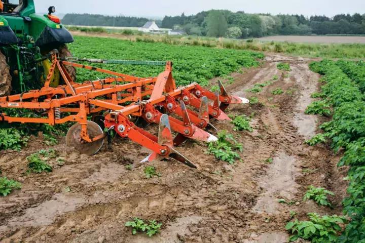 Créer des buttes dans le rang de pommes de terre permet de limiter l’érosion, de retenir l’eau près des plants, mais aussi de gagner en calibre et en homogénéité.
