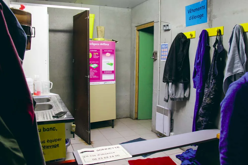 Suite à la formation biosécurité organisée par le groupement porc, quelques changements ont été apportés en termes de biosécurité : l’élevage disposait déjà d’un sas à l’entrée. Le responsable d’élevage a rajouté un banc pour séparer la zone externe de la zone interne. « Chaque personne qui intervient dans l’élevage change de bottes à chaque stade physiologique. », précise-t-il. « Des habitudes que les élèves adoptent assez facilement et qu’ils reproduiront en élevage ».