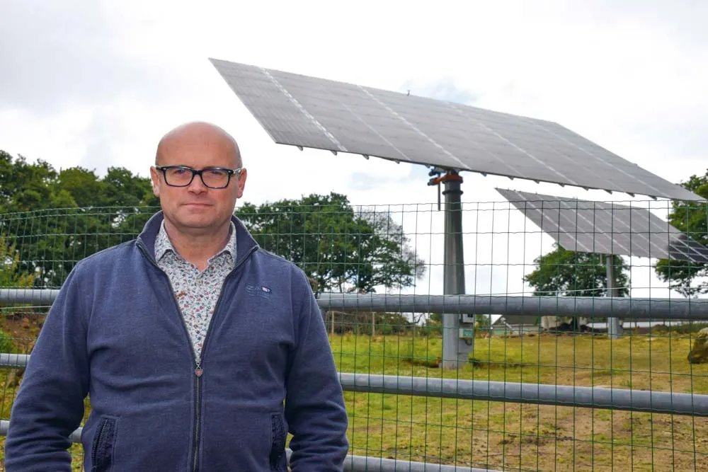 Ils ont poussé il y a un peu plus d’un an, dans cette prairie verdoyante de Pleyber-Christ (29), située en bordure de la route départementale qui, quelques kilomètres plus loin, serpente à travers le Parc naturel régional d’Armorique. Tels des tournesols géants, les six trackers suivent la course du soleil. Perchés au sommet de mâts de 7 mètres, ces panneaux photovoltaïques mobiles assurent ainsi, quelle que soit la luminosité, un rendement maximum. À intervalles réguliers, un léger bruit se fait entendre lorsque la motorisation se met en route. Mais pas de quoi perturber les bovins qui paissent au pied, ni effrayer les poules qui évoluent non loin en plein air.