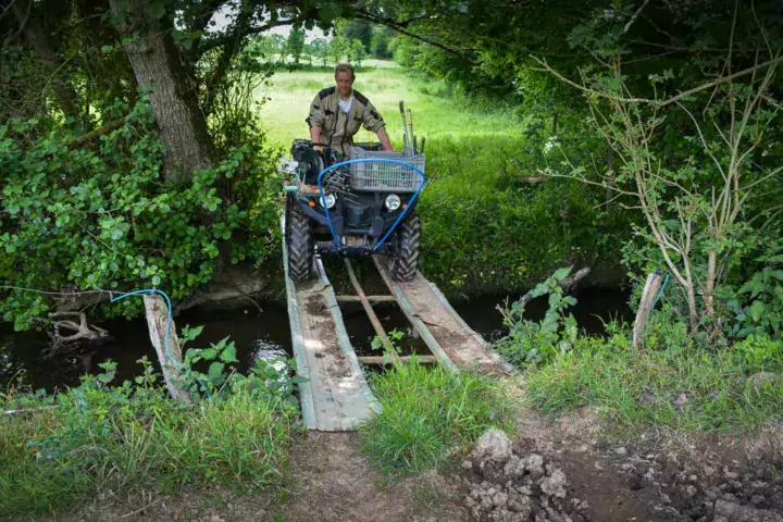 Le quad sert aussi pour aller chercher les animaux avec le chien. « Les vaches sont habituées, elles nous suivent », poursuit Emilie Rondel. Il est également pratique pour aller de la stabulation laitière au bâtiment allaitant en quelques minutes, en passant à travers champ. Pour traverser les deux rivières dans la vallée, l’éleveur a mis en place un pont avec des tubulaires et des tôles placées par rapport aux dimensions des roues du quad. « Les vaches et les veaux ne les franchissent pas », explique-t-il. Le premier quad est arrivé sur l’exploitation en 1998. Le dernier date de 2006. Aujourd’hui, Wilfrid et Emilie auraient du mal à se passer de cet engin motorisé à la fois utile et ludique. Un matériel qui se pilote avec un casque.