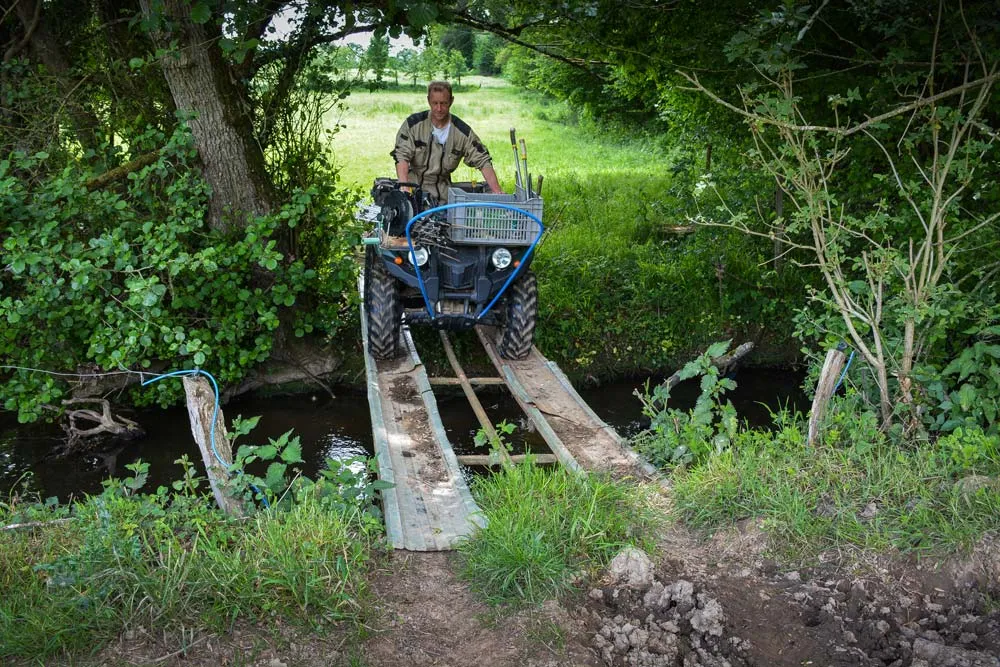 Le quad sert aussi pour aller chercher les animaux avec le chien. « Les vaches sont habituées, elles nous suivent », poursuit Emilie Rondel. Il est également pratique pour aller de la stabulation laitière au bâtiment allaitant en quelques minutes, en passant à travers champ. Pour traverser les deux rivières dans la vallée, l’éleveur a mis en place un pont avec des tubulaires et des tôles placées par rapport aux dimensions des roues du quad. « Les vaches et les veaux ne les franchissent pas », explique-t-il. Le premier quad est arrivé sur l’exploitation en 1998. Le dernier date de 2006. Aujourd’hui, Wilfrid et Emilie auraient du mal à se passer de cet engin motorisé à la fois utile et ludique. Un matériel qui se pilote avec un casque.