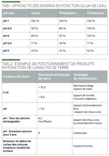 « Par exemple, l’efficacité des engrais varie fortement en fonction du pH du sol » (tableau 1). Cependant, d’autres facteurs que le pH sont à prendre en compte dans la stratégie de fertilisation. « Ainsi, le rapport carbone/azote de la parcelle va influencer le choix du type de fertilisants organique à apporter et celui des espèces de couverts végétaux à implanter selon leur teneur en carbone ou azote » (tableau 2). Enfin, la fertilisation n’est pas la seule solution pour nourrir et entretenir son sol. « Il convient de revenir aux fondamentaux de l’agronomie. La réussite d’une culture est très dépendante des conditions climatiques, le démarrage est essentiel. Les rotations, le travail et la couverture du sol, la fertilisation, la gestion des adventices doivent être raisonnées avant toute implantation. »