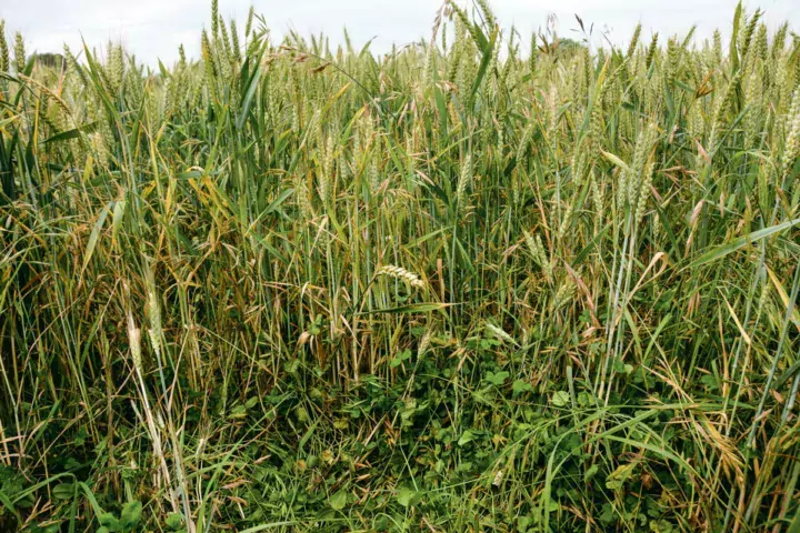 Cette quantité de trèfle est récoltée pour nourrir les animaux de l’exploitation. 2,5 t/ha sont ainsi stockées en enrubanné. « Les tiges de colza sont auparavant broyées pour éviter de percer le film ». Les quelques brins de paille de colza tout de même récoltés au rotocut et distribués pendant l’hiver feront davantage ruminer les vaches. Une céréale est ensuite implantée dans cette dérobée de trèfle. Une légère pulvérisation de désherbant total « met le trèfle en sommeil, règle les problèmes de brome. Un blé est préféré à une orge, plus risquée, car la légumineuse peut prendre le dessus de la culture avant moisson ».