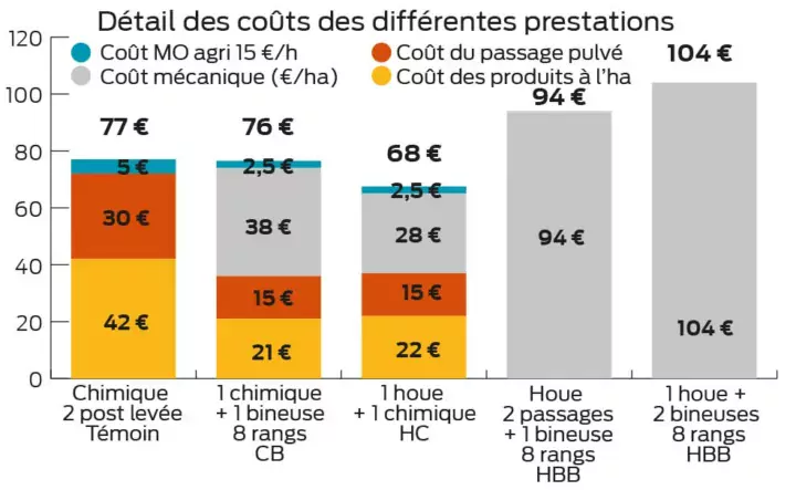 « Que ce soit sur la notation de la flore adventive présente dans la parcelle ou avec une approche plus économique incluant le temps de travail, la houe rotative, suivie d’un rattrapage chimique confirme son efficacité technique et économique en 2019, comme sur les essais menés en 2017 », conclut Anaïs Charmeau.