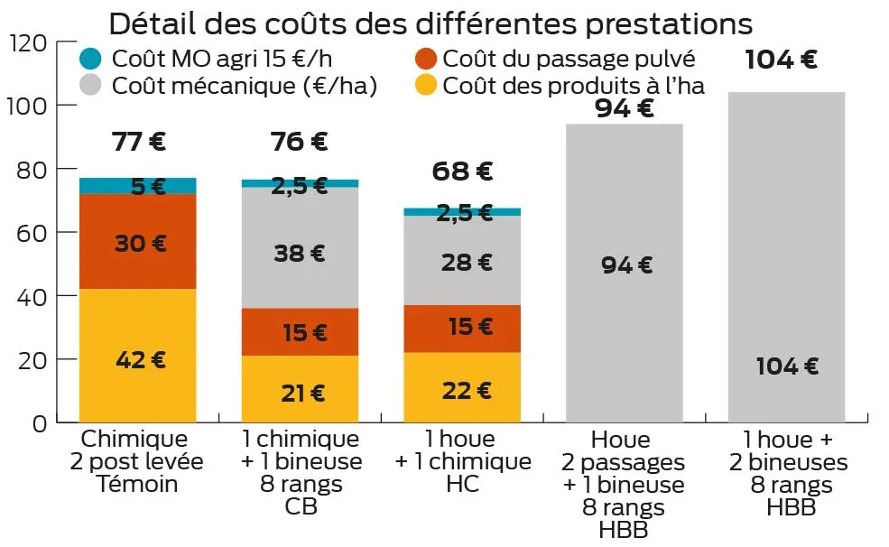 « Que ce soit sur la notation de la flore adventive présente dans la parcelle ou avec une approche plus économique incluant le temps de travail, la houe rotative, suivie d’un rattrapage chimique confirme son efficacité technique et économique en 2019, comme sur les essais menés en 2017 », conclut Anaïs Charmeau.