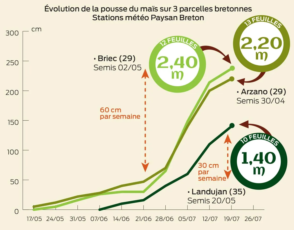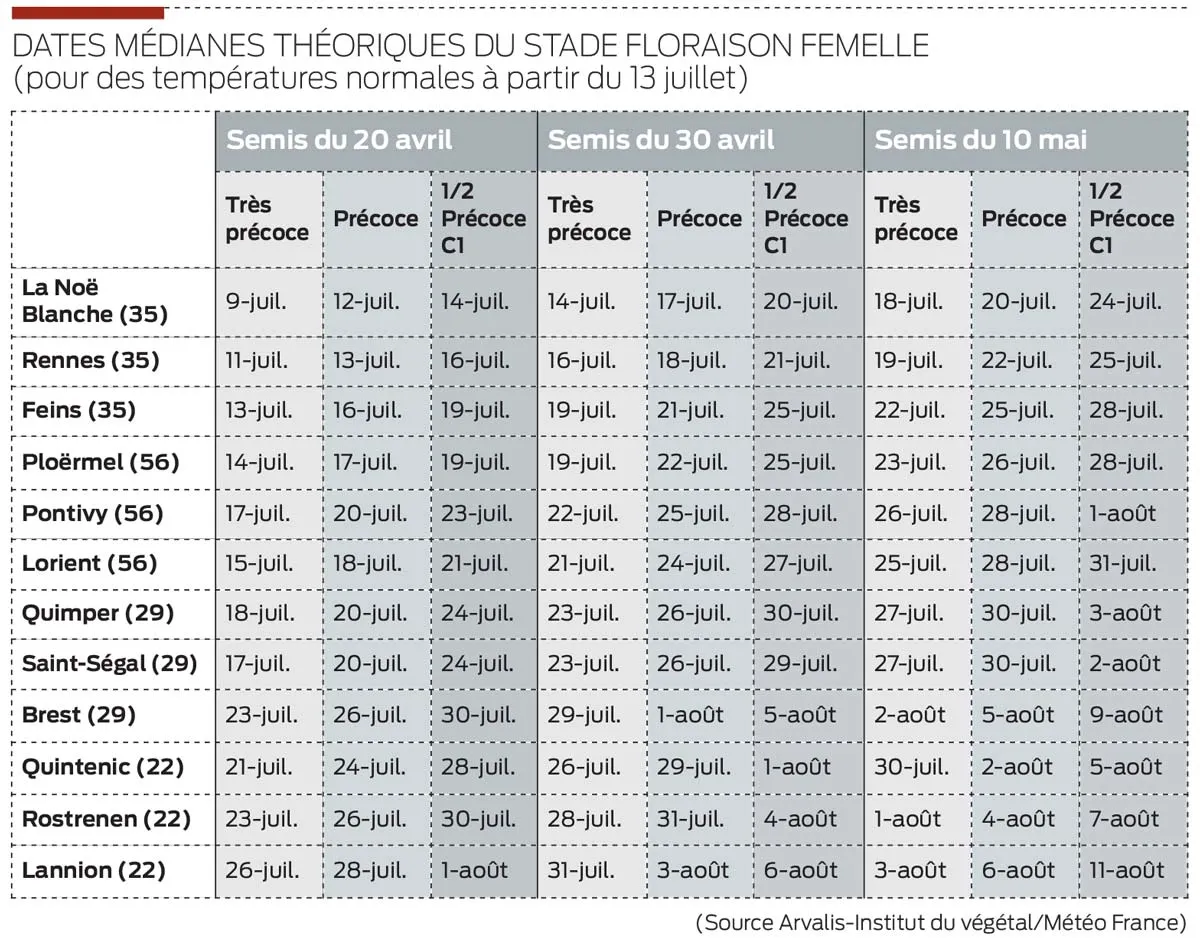 Le début de la campagne a été marqué par des températures inférieures aux normales. La période de canicule observée fin juin et les températures plus élevées de 2,7°C par rapport aux normales saisonnières sur les 15 premiers jours de juillet ont permis un rattrapage des stades. Les dates prévues de floraison sont proches de la normale, majoritairement entre le 20 juillet et début août.
