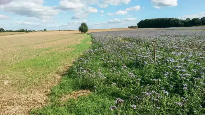 Cette technique de semis de couvert avant moisson peut se faire dans des parcelles propres qui ne sont pas infestées de vivaces. Il est possible de semer plus de 60 ha dans la même journée. « Le coût à l’hectare est de l’ordre de 9 € tout compris, nous avons estimé avoir consommé 2 L de carburant pour semer 4 ha. Avec de la phacélie il faut semer entre 8 et 10 kg/ha. Dans cette parcelle de blé, nous avons mélangé 4 kg de phacélie avec 4 kg de radis », décrit le conseiller agronomie. Le couvert doit être semé dans les 10 jours qui précèdent la moisson. Si le temps est incertain, il faut idéalement y aller 48 heures avant de moissonner.