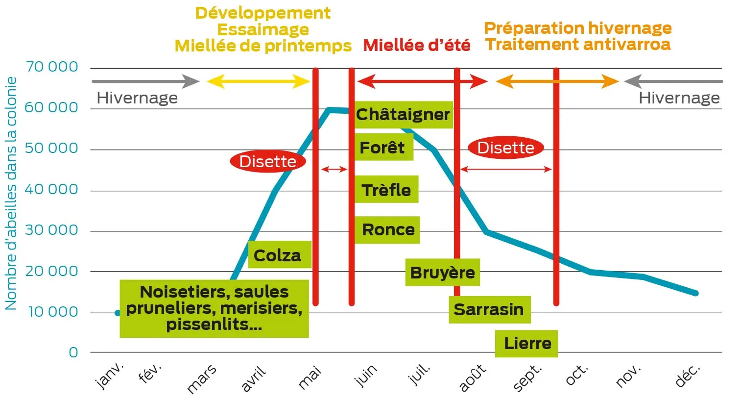 Cependant, même si les apiculteurs ont laissé du miel dans les ruches, il y a eu une période de disette alimentaire pour les abeilles après la floraison du colza : il n’y a en effet que peu de fleurs intéressantes pour les abeilles à cette époque-là. C’est donc sur cette période de mai-juin, ainsi qu’à l’automne, lorsque les abeilles font leur réserve de miel pour passer l’hiver, qu’il est intéressant d’avoir des plantes en fleurs : implantez par exemple de la phacélie ou laissez pousser ronces, aubépines et fleurs de bords de champs.