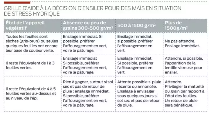 Sauf cas extrêmes (maïs sans épi), la décision doit être prise après le stade limite d’avortement de grains, soit environ 15-20 jours après la floraison femelle. La décision sera prise en fonction du grain (nombre de grains par m² et stade de maturité) pondéré par l’état de l’appareil végétatif. Et si la part des surfaces de maïs stressées est significative sur l’exploitation : plutôt que de trouver un mauvais compromis pour la date de récolte, il peut être judicieux d’envisager 2 chantiers d’ensilage. En récoltant d’abord les parcelles, ou les parties de parcelles, les plus avancées.