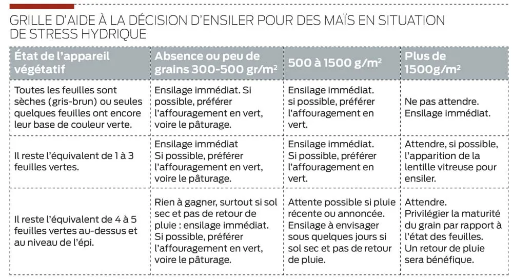 Sauf cas extrêmes (maïs sans épi), la décision doit être prise après le stade limite d’avortement de grains, soit environ 15-20 jours après la floraison femelle. La décision sera prise en fonction du grain (nombre de grains par m² et stade de maturité) pondéré par l’état de l’appareil végétatif. Et si la part des surfaces de maïs stressées est significative sur l’exploitation : plutôt que de trouver un mauvais compromis pour la date de récolte, il peut être judicieux d’envisager 2 chantiers d’ensilage. En récoltant d’abord les parcelles, ou les parties de parcelles, les plus avancées.