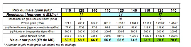Le tableau ci-dessous estime une valeur sur pied selon 3 hypothèses de prix du grain nets de séchage : 110€, 125€ et 140€/ t. Une variation de 10 €/tonne de grain aura pour conséquence une variation d’environ 5,5 €/tonne de MS sur pied.