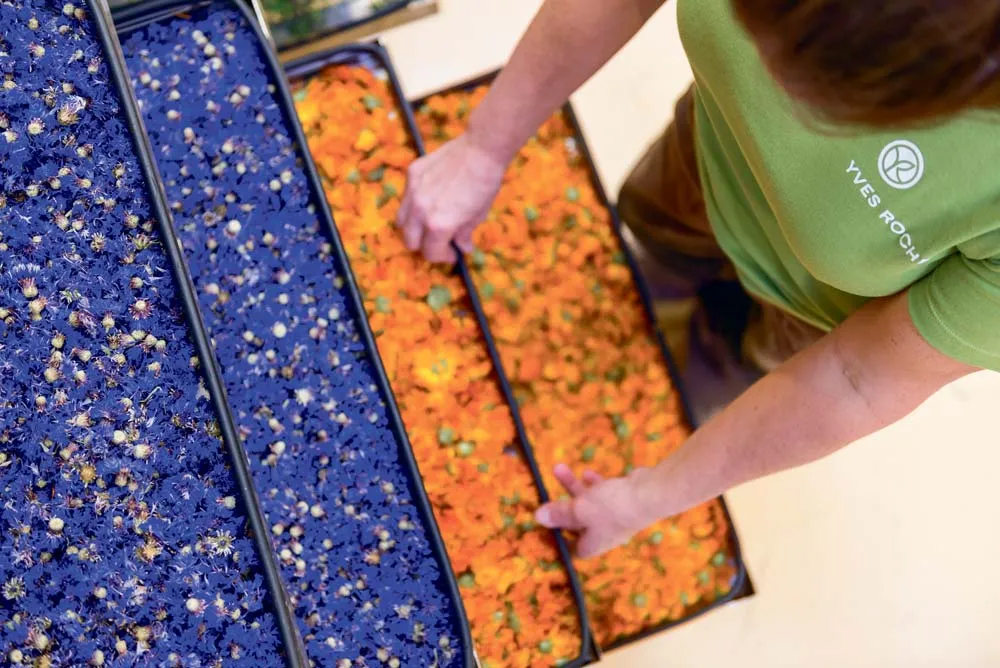 Les récoltes sont manuelles pour le bleuet , la camomille romaine et le souci, « car les extraits huileux sont sensibles à la couleur ; les tiges sont exclues ». Les autres espèces sont récoltées à la faucheuse auto-chargeuse. Les plantes sont séchées sur place, en séchoir, jusqu’au stade de 8 à 10 % d’humidité puis conservées sous abri avant leur expédition vers les différents ateliers de transformation où sont élaborés les produits cosmétiques. L’essence des petites fleurs de La Gacilly se retrouve ainsi dans les magasins spécialisés d’une centaine de pays dans le monde.