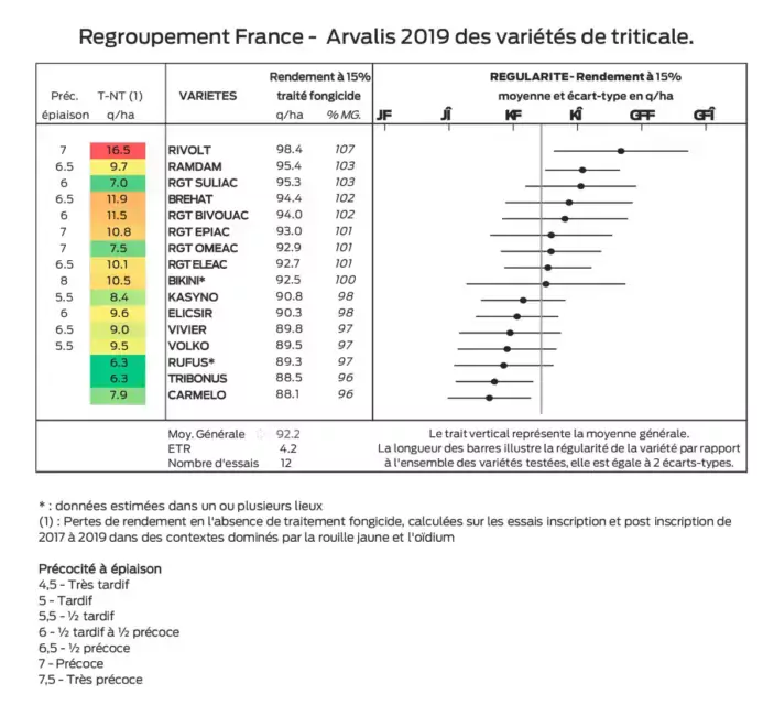 À noter la bonne tolérance à ces 2 maladies (oïdium et rouille jaune) très préjudiciables sur triticale de BREHAT, RGT OMEAC, RGT ELEAC, VIVIER, VOLKO. Il conviendra de compléter ces informations sur le potentiel variétal par les caractéristiques qualitatives et la résistance aux accidents. L’ensemble des variétés seront précisément décrites dans le numéro spécial implantation qui paraîtra dans Paysan Breton en septembre.
