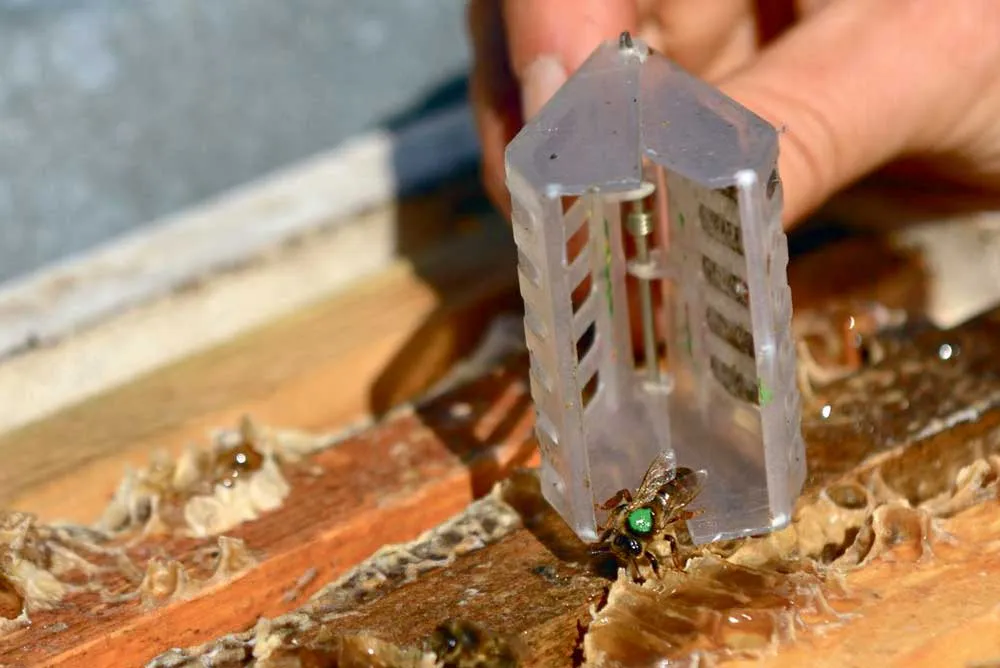 Myriam Boucaud, apicultrice salariée par le Conservatoire, est venue voir comment se développent les jeunes essaims qu’elle a elle-même « mis en boîtes », il y a de cela un mois. Elle soulève un couvercle, y introduit un peu de fumée pour prévenir de sa visite, puis prélève un cadre. Les ouvrières continuent à travailler comme si de rien n’était. Myriam souffle sur l’amas grouillant pour l’éclaircir : elle cherche la reine… Mais pas facile de l’identifier puisqu’elle n’est pas encore marquée. « Ah, la voilà ! ». À l’aide d’une pince, elle la capture, puis la saisit entre ses doigts et lui dépose sur le haut du thorax une goutte de vernis vert : « L’année dernière, c’était rouge ! ». Elle libère la reine, replace le couvercle en collant dessus une étiquette datée, puis note au marker : « Reine vue, ponte OK, couvain operculé ». Autrement dit : greffage reussi, de nouvelles abeilles vont naître, la nouvelle colonie se porte bien.