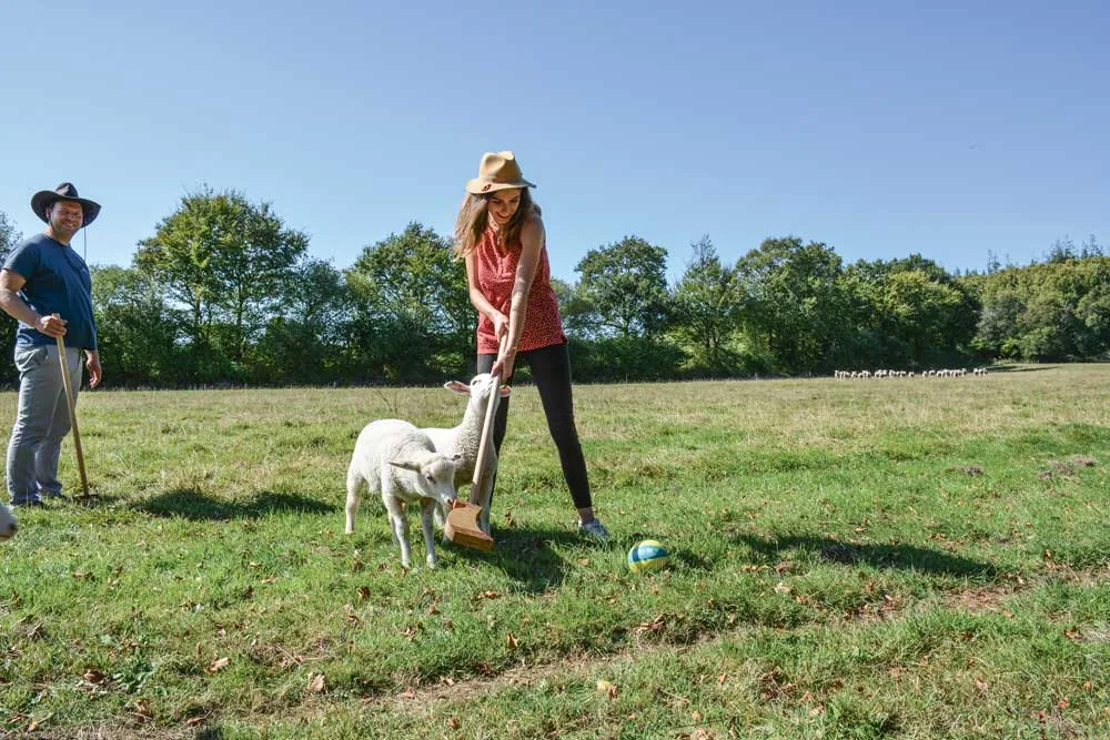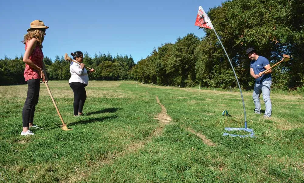 « L’idée était de créer de la valeur ajoutée sur l’exploitation sans me rajouter de travail. Je ne voulais pas développer la vente directe qui demande beaucoup de temps pour la partie commercialisation. » Ce concept de golf paysan séduit l’éleveur de Belle-Isle-en-Terre qui décide donc de le développer sur sa ferme. Depuis cet été, les golfeurs en herbe peuvent venir taper la balle parmi les moutons dans la parcelle de 2 hectares qui totalise 9 trous et qui est nichée en fond de vallée en bordure de la forêt de Coat Noz. Le golf paysan se veut simple, ludique et sans prétention. Il se pratique avec un club en forme de sabot et un petit ballon tout terrain. Les trous sont au milieu de socles en béton déplaçables ce qui permet de modifier régulièrement le parcours afin de varier les difficultés ou créer de nouvelles thématiques. Le principe est le même qu’au golf : il faut atteindre les trous en réalisant le moins de coups possible. « C’est une balade, il faut venir en famille, entre amis. C’est une bonne idée pour les sorties d’entreprise ou encore pour les enterrements de vie de jeune fille ou de garçon », décrit David Maurice.