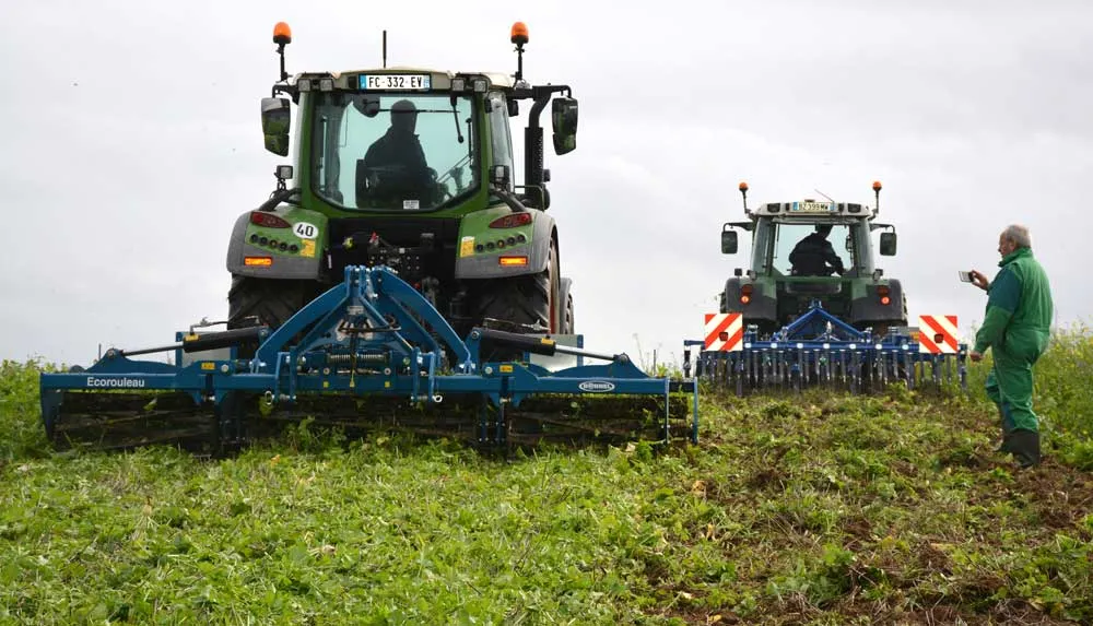 Lors de la démonstration, les couverts ont été soumis au passage de différents outils. Le rouleau hacheur Treffler TSW est constitué de trois rouleaux : le premier avec une lame droite aide à coucher la végétation et à préparer le travail ; les deux autres, sur balancier et avec des lames hélicoïdales, suivent le terrain et blessent la plante. L’objectif est de ne pas toucher le sol. Autre outil du même constructeur : un scalpeur à 13 socs, complémentaire du rouleau, qui a travaillé à 4 cm. Les socs scalpent sur toute la surface et sont suivis de lames niveleuses et de 3 rangées de herses-peignes.