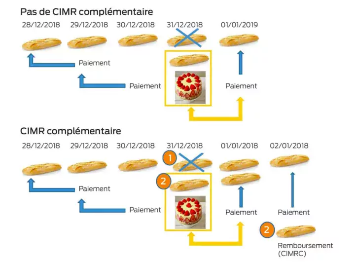Dans le cas de notre boulanger, imaginons que le client ait acheté 1 seul pain par jour les 28/29 et 30 décembre, il a donc réglé 1 pain (le deuxième acheté le 31/12/2018) le 1er janvier 2019 en plus de celui du jour. S’il en avait acheté 2 ou plus pendant les jours de références, il n’aurait pas eu à régler de pain sauf celui du jour. Toutefois, un rattrapage est possible, c’est le Crédit d’impôt pour modernisation du recouvrement complémentaire (CIMR C).
