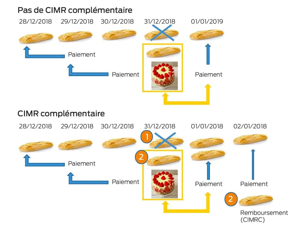 Dans le cas de notre boulanger, imaginons que le client ait acheté 1 seul pain par jour les 28/29 et 30 décembre, il a donc réglé 1 pain (le deuxième acheté le 31/12/2018) le 1er janvier 2019 en plus de celui du jour. S’il en avait acheté 2 ou plus pendant les jours de références, il n’aurait pas eu à régler de pain sauf celui du jour. Toutefois, un rattrapage est possible, c’est le Crédit d’impôt pour modernisation du recouvrement complémentaire (CIMR C).