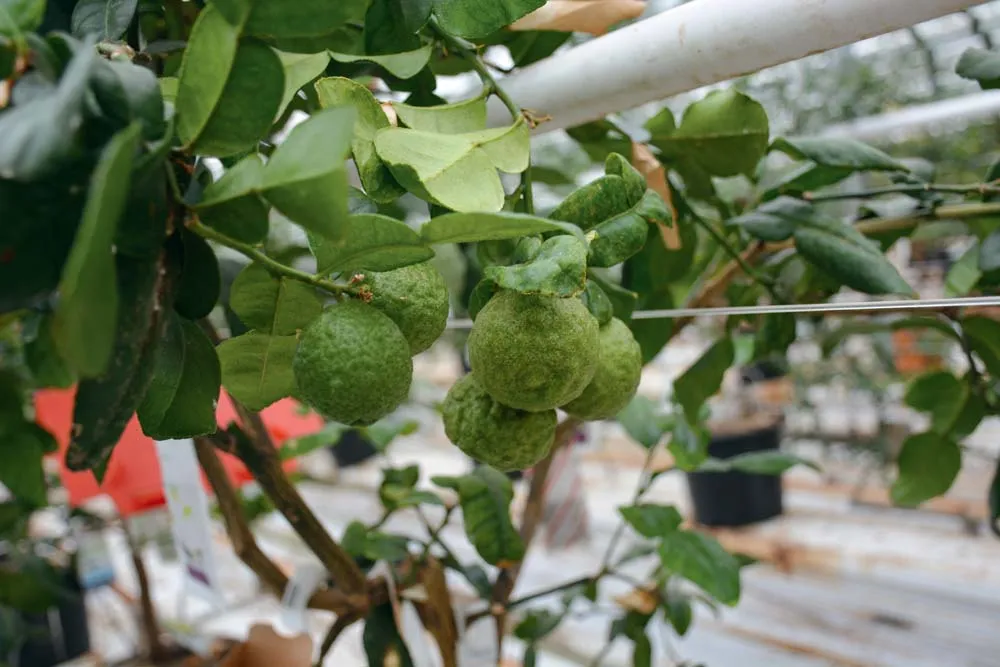 Les plants sont achetés en Sicile, ils ont une durée de vie comprise entre 20 et 30 ans. Ils avaient déjà 3 ans lorsque Gilles les achète. Ils fleurissent et produisent toute l’année. Dans la serre, ils sont en pots et alimentés en eau et en fertilisant par un système de goutte-à-goutte. L’objectif est de pouvoir les mettre en pleine terre et passer en bio d’ici quelques années, mais pour le moment les producteurs se familiarisent avec cette nouvelle culture. Les agrumes offrent l’avantage d’être beaucoup moins consommateur en énergie et en main-d’œuvre que la tomate par exemple.