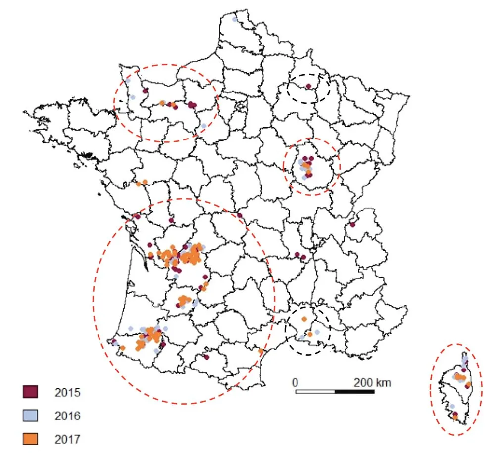Ces chiffres nationaux masquent en réalité une grande variabilité territoriale. Les cas sont regroupés essentiellement dans de grandes zones d’enzootie aux contextes et à l’épidémiologie différentes : Sud-Ouest, Corse, Côte d’Or, Normandie élargie à l’Eure-et-Loir (voir carte).