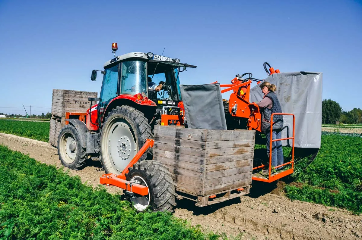 La P3CL Profi de chez Dewulf est une machine de récolte par préhension portée de 1 rang, autonome grâce à une centrale hydraulique alimentée par la prise de force du tracteur. Un opérateur situé en sortie d’équeutage peut contrôler et trier les carottes défectueuses. Les racines de qualité tombent dans un pallox porté par la machine sur des fourches hydrauliques. Le chauffeur vient enfin déposer ces containers une fois remplis, puis recharge une autre caisse vide.