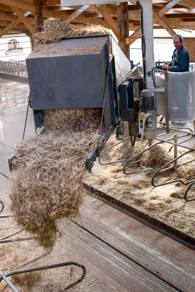 Une fois sur la plateforme, un opérateur seul fait rouler une botte dans la machine. Puis il se rend au poste de commande pour démarrer son vol au-dessus de l’étable. Le déplacement de l’ensemble dépend d’une petite roue crantée sur le rail entraînée par un moteur électrique. « Les premières fois, cela est assez impressionnant car l’engin balance un peu. Mais après trois jours d’utilisation, la maîtrise est acquise. » D’ailleurs, au Gaec, où la tradition est de changer de mission hebdomadaire (traite, paillage, alimentation…) tous les lundis matin « pour tout savoir sur l’exploitation et conserver de la polyvalence », chaque associé sait s’en servir. Après la traite du matin, en moins de 15 minutes, une botte de 300 kg de paille est distribuée aux 128 logettes. « Le produit est démêlé puis tombe du tapis de déversement par gravité. Cela produit peu de poussière. » Sur son axe, la machine peut exercer une rotation de 340° permettant d’envoyer le produit vers chaque rang de logettes tête-à-tête. On vise dans l’espace entre les deux rangées de logettes. « Ensuite, les vaches se débrouillent par elles-mêmes. Machinalement, elles tirent la paille vers elles et font leur nid. »