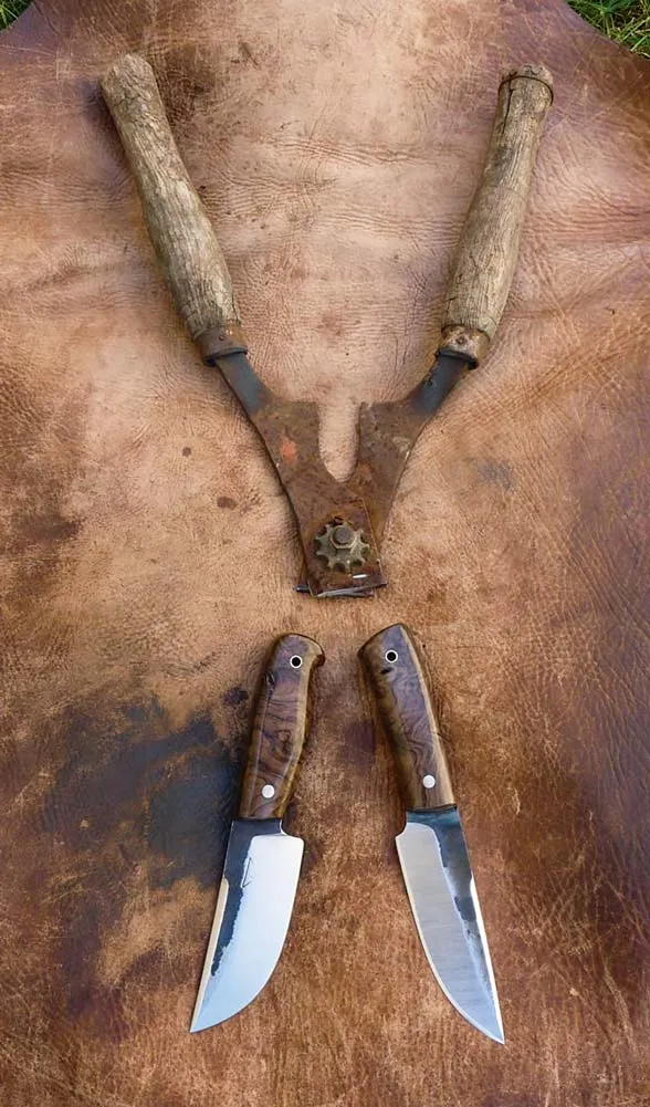 En 2004, il quitte l’Alsace avec sa famille pour s’installer à Noyal-sur-Vilaine puis à Châteaubourg en Bretagne. Ce sera le déclic : « On quittait un appartement pour une maison avec jardin et cela m’a donné l’occasion de me remettre au tir à l’arc. J’ai ensuite rapidement intégré le club du secteur. » En naviguant sur Internet et notamment en échangeant sur les forums spécialisés, il a créé ses propres équipements pour l’archer. « Je me suis mis à travailler le cuir, cela ne demande pas beaucoup de matériel. En suivant des tutos sur Internet, j’ai fabriqué des brassards de protection pour l’avant-bras mais aussi des carquois pour les flèches. » En poursuivant ses échanges sur les forums, il découvre le travail de l’acier et la coutellerie. Il investit alors 250 € pour acheter une forge à charbon et une enclume qu’il trouve dans une ferme du coin. « Entre 2006 et 2009, j’ai fait mon apprentissage tout seul et tous les week-ends je faisais mes gammes sans penser que j’allais en faire mon métier. » Les premiers couteaux forgés plaisent beaucoup aux membres du club de tir à l’arc. Et, avec la demande grandissante, il se lance dans le métier de coutelier en tant qu’auto-entrepreneur en parallèle de son emploi de directeur commercial.