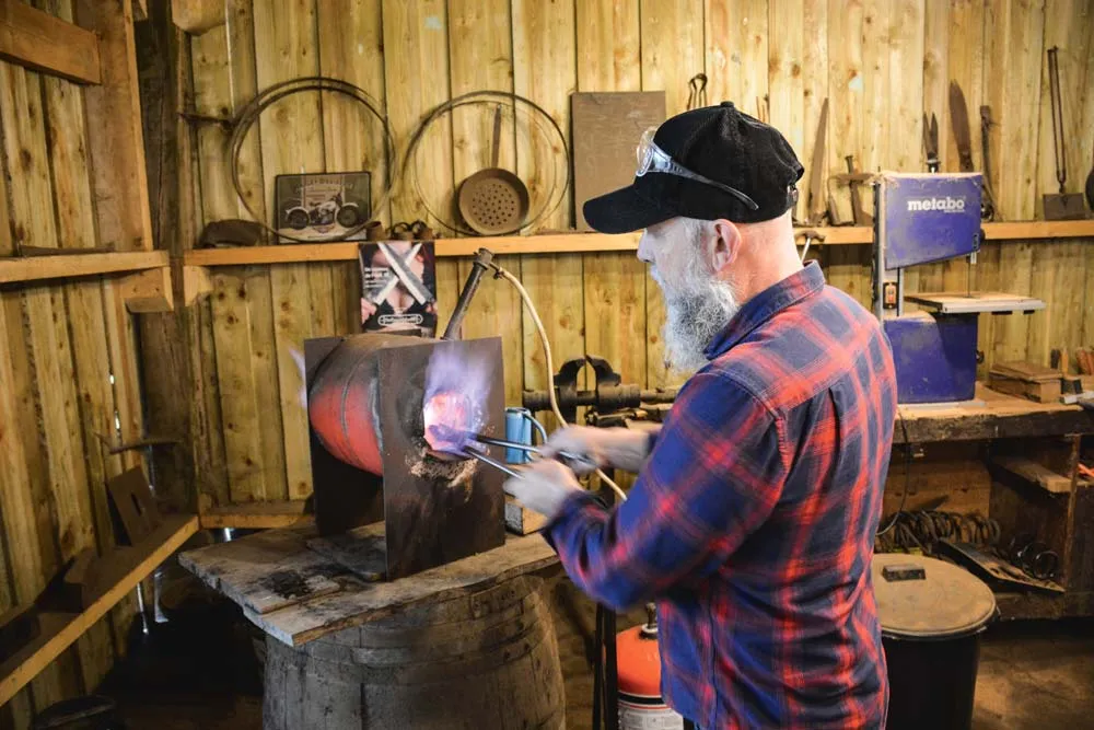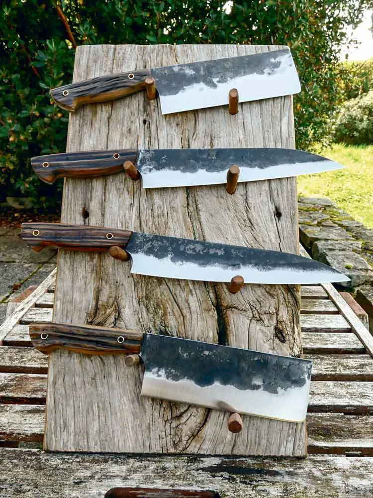 Frédéric Marchand crée des couteaux qui ont une âme : il forge la lame dans d’anciennes râpes de maréchal ferrant. Et, pour le manche, il redonne vie à du bois comme avec ce chêne provenant de tonneaux dans lesquels était conservé le vin sur les quais de Bercy à Paris en 1880.