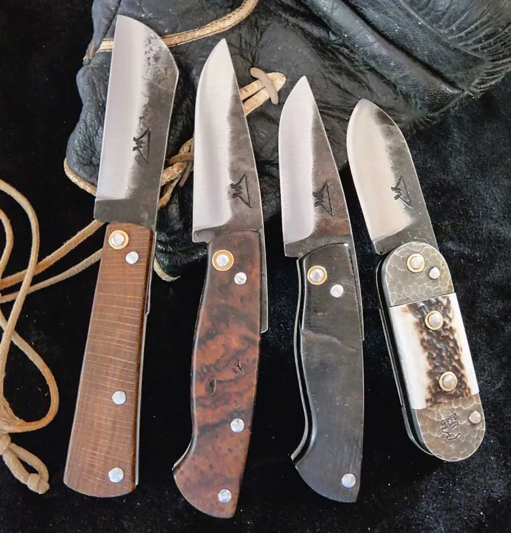 À partir de 2009, il commence à participer à des salons pour présenter ses créations à une clientèle de connaisseurs. La mayonnaise prend, les clients appellent et les commandes tombent. « Cela fonctionnait tellement bien que je n’avais plus de jours de repos entre mon boulot de directeur commercial la semaine et la fabrication de couteaux le week-end et certains soirs. Il y a 2 ans, j’ai donc décidé de quitter mon travail pour me consacrer à 100 % à la coutellerie. » Il faut dire qu’un couteau fait par Frédéric Marchand ne ressemble à aucun autre couteau. En se formant tout seul, le coutelier n’a pas été influencé par le style de quelqu’un d’autre et il s’est forgé sa propre identité. « Il est très important d’avoir sa marque de fabrique pour pouvoir se différencier des autres. Une personne qui connaît mon travail va facilement reconnaître un de mes couteaux parmi les autres. J’aime conserver au maximum le côté brut de la matière que j’utilise pour fabriquer la lame ou le manche d’un couteau. Leur dos est légèrement courbé avec toujours la même géométrie sur le manche du couteau. La lame est signée à chaud d’une enclume en forme de M. »