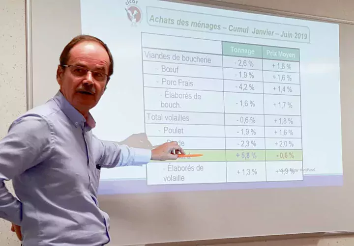 Point d’orgue de la réunion, Bernard Brunel a présenté les actualités du marché national et international, dont les conséquences affectent la filière. Une consommation de viande en baisse, sauf pour le poulet, mais cette bouffée d’oxygène profite exclusivement aux importations intra-communautaires. En effet, là où la France accuse une baisse de production de 7 % en dinde et 4 % en poulet au 1er semestre, nos pays voisins se stabilisent (Allemagne), voire progressent (Pologne, Espagne). Plus difficile encore, le canard de barbarie subit une véritable crise. Le canard gras est revenu en force après une période de crise sanitaire (Influenza aviaire), gonflant ainsi le stock de magret. Par ailleurs, nos pays voisins délaissent le filet de barbarie au profit du Pékin, moins cher et élevé sur paille, donc répondant mieux aux attentes sociétales. Les éleveurs subissent donc des vides sanitaires de 50 jours et la tendance devrait se maintenir au moins jusqu’à mi-2020.