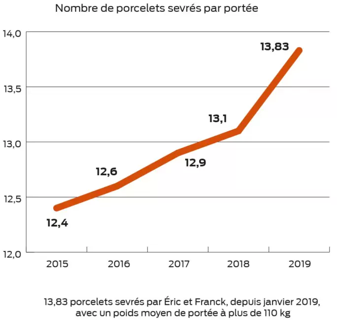 Le travail quotidien d’Éric et Franck explique ces bons résultats par le respect, notamment, des fondamentaux : l’état des truies à l’entrée en maternité, le fractionnement des repas, la quantité d’eau. L’éleveur détaille que « de l’eau est distribuée pendant le repas avec l’aliment. Il y a ensuite un ajout manuel d’eau 2 fois par jour en fonction de la consommation de la truie malgré la présence d’abreuvoirs. » Par ailleurs, il porte une attention particulière à l’allotement. Les porcelets sont allotés environ 12 heures après la fin de mise bas, par gabarit. Les gros porcelets sont allaités par les truies les plus vieilles. « Nous voulons des porcelets homogènes au sevrage et nous faisons aussi des portées adoptives. » Autre paramètre qui a son importance : la température du nid. Elle est de 27 °C pour une consigne ventilation de la salle à 20 °C. « Notre objectif est que le porcelet se réchauffe vite, c’est pour cela que le nid est chaud et confortable. La lampe est basse pendant la mise bas. Elle est relevée une fois terminée afin que les porcelets ne s’étalent pas trop en dehors du nid. »