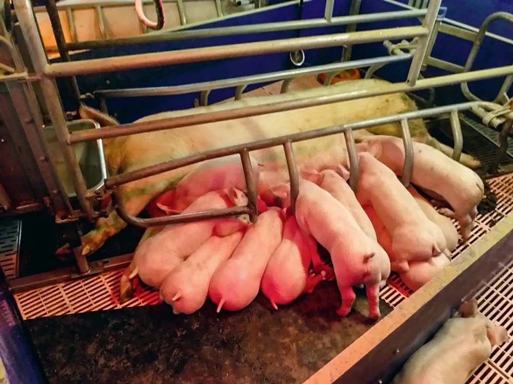 Le travail quotidien d’Éric et Franck explique ces bons résultats par le respect, notamment, des fondamentaux : l’état des truies à l’entrée en maternité, le fractionnement des repas, la quantité d’eau. L’éleveur détaille que « de l’eau est distribuée pendant le repas avec l’aliment. Il y a ensuite un ajout manuel d’eau 2 fois par jour en fonction de la consommation de la truie malgré la présence d’abreuvoirs. » Par ailleurs, il porte une attention particulière à l’allotement. Les porcelets sont allotés environ 12 heures après la fin de mise bas, par gabarit. Les gros porcelets sont allaités par les truies les plus vieilles. « Nous voulons des porcelets homogènes au sevrage et nous faisons aussi des portées adoptives. » Autre paramètre qui a son importance : la température du nid. Elle est de 27 °C pour une consigne ventilation de la salle à 20 °C. « Notre objectif est que le porcelet se réchauffe vite, c’est pour cela que le nid est chaud et confortable. La lampe est basse pendant la mise bas. Elle est relevée une fois terminée afin que les porcelets ne s’étalent pas trop en dehors du nid. »