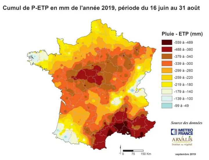 Le fait le plus marquant de la campagne reste le déficit hydrique estival, aussi marqué qu’en 2018, mais plus précoce et accentué par deux séquences de températures très élevées, fin juin et fin juillet. La Bretagne a été moins impactée que d’autres régions françaises : Centre, Est… (voir carte). Mais dans le sud et l’est de la région, comme dans les Pays de la Loire, les maïs ont souffert de ces conditions climatiques.