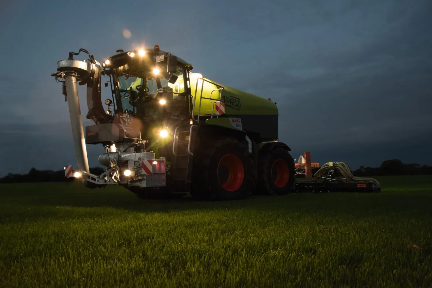 CLAAS fait confiance à son partenaire hollandais KAWECO pour l’équipement d’épandage. Le XERION est ici équipé d’une unité frontale. Cette dernière se compose d’un bras doublement articulé permettant le pompage d’effluent directement dans une fosse mais surtout dans une cuve « tampon » ou de ravitaillement en bout de champs. Ce dispositif procure une vue optimale au chauffeur. En effet, le bras se trouve directement devant la cabine, son contrôle en est donc facilité. L’unité frontale est également équipée d’un broyeur et d’un bac à pierre afin de pouvoir limiter le pompage de corps étranger. Un accélérateur hydraulique vient gaver une pompe à lobes grosse capacité (9000 l/min) et faire que la cuve de 16m3 puisse être remplie en moins de 2 minutes. Le polyester est retenu pour la cuve, afin de bénéficier d’un point à vide le plus faible possible.