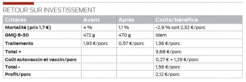 « Nous avons alors mis en place un autovaccin contre Streptococcus suis 9, sur les truies, 3 et 6 semaines avant la mise bas. L’objectif était de protéger les porcelets via le colostrum ». Le sevrage des premières bandes de porcelets issus de mères vaccinées a lieu en mai 2017. La clinique avec troubles nerveux et arthrites ne faiblit pas… Au mois d’août suivant, de nouvelles analyses sur porcelets permettent de détecter une autre souche de streptocoque (Suis 2). Un autovaccin est élaboré avec les deux souches et appliqué sur les bandes de truies, avec succès. Depuis, les pertes sont revenues à un niveau normal : 1,1 % en PS et 2,3 % en engraissement. Un soulagement pour les éleveurs qui sevrent actuellement 13,7 porcelets par portée ; l’élevage affiche un GMQ 8-30 de 502 g et 30-115 de 831 g.