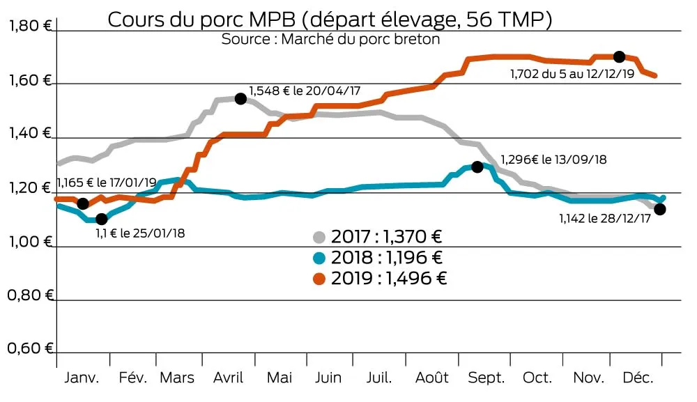 Au marché du porc breton (MPB), le dernier cours de l’année s’est établi à 1,63 euro prix de base, ce qui porte le prix moyen de l’année à 1,496 euro, en hausse de 30 cents par rapport à 2018, « soit une progression de 25 % ». Selon les analystes du Marché du porc breton (MPB), « le cours n’avait pas été aussi élevé depuis l’année 1992 ». Selon les pays et les performances de 2018, le cours du porc européen a varié de +19 % à +27 %, précise le MPB.