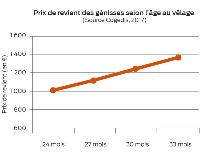 Pour atteindre cet objectif d’âge au vêlage, les repères à retenir sont les suivants : 200 kg à 6 mois, 15 mois à l’IA, 24 mois au vêlage. Pour cela, il est nécessaire d’avoir une croissance optimale sur la phase naissance-sevrage. Cela passe par l’utilisation d’aliment d’allaitement, toujours avantageux sur le plan économique par rapport au lait entier.