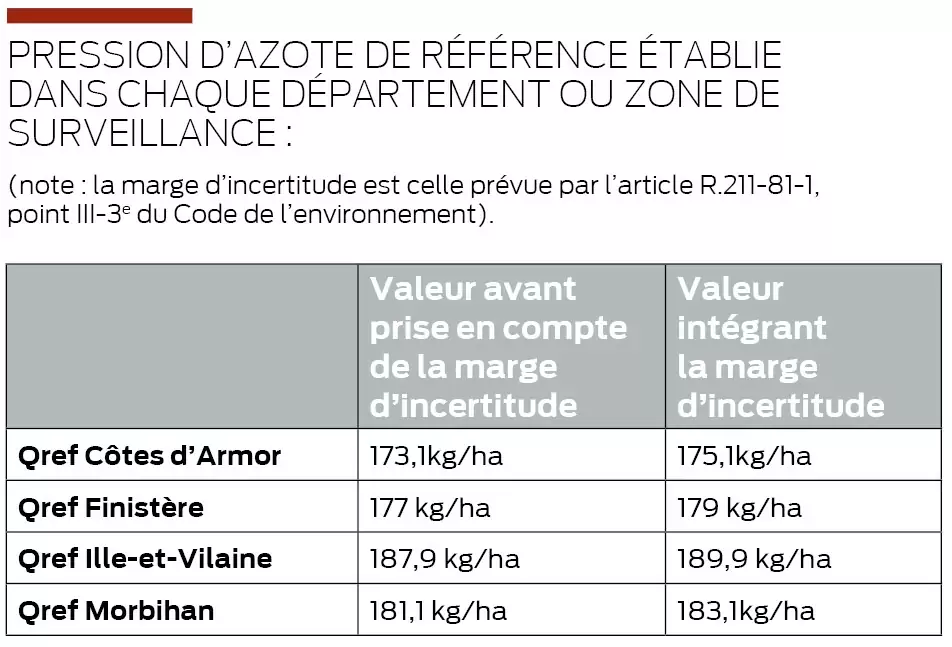 Désormais, le suivi ne s’effectue plus uniquement sur l’azote organique produit mais sur l’azote total épandu et une marge d’incertitude de 2 kg/ha est instaurée. En cas de dépassement de la qualité de référence (Qref) supérieur à la marge et afin de ramener la moyenne départementale à un niveau inférieur, la préfecture mettra en place un dispositif au plus tard au 31 août de l’année N+1, qui imposera des baisses d’azote épandu à chaque exploitation sur la campagne de l’année N+2. L’effort de réduction doit être réparti sur l’ensemble des exploitants qui auront déclaré les pressions d’azote/hectare les plus élevées.