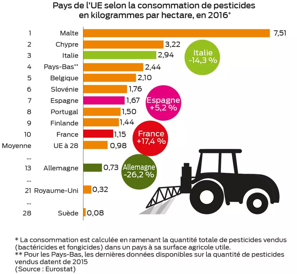 L’environnement est aussi un enjeu. Il n’y a pas d’indicateur idéal concernant l’utilisation des produits phytosanitaires, mais on voit qu’en Europe, 0,98 kg de molécules par hectare sont utilisées. L’Allemagne est le pays le mieux positionné avec une tendance à la baisse entre 2011 et 2016. La France, avec 1,15 kg de molécules/ha, a subi une hausse de 5 % entre 2011 et 2016. L’Italie (grand producteur de fruits et légumes) a le plus d’efforts à faire sur ce point : 2,94 kg de molécules / ha.