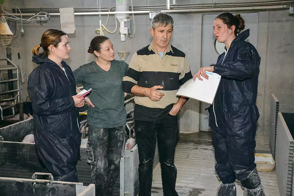 « Les salariés démarrent leur journée à 8 h. Ils ont le temps de faire le tour des cases, de s’occuper des nouveau-nés et d’inspecter les auges avant la première distribution. Le deuxième repas, fixé en début d’après-midi, leur permet de voir si les truies ont bien mangé avant de quitter l’élevage ». Un repas supplémentaire est ajouté à 5 h quand les truies passent à l’aliment allaitante pour favoriser la consommation. L’eau est distribuée automatiquement en mélange dans l’auge à raison de 10-12 litres par jour, pour avoir un aliment consistant (le doseur libère 57 g à la fois (la truie doit bouger la sonde dans la descente d’aliment de l’auge avec son groin pour commander la dose suivante). Le complément d’eau est disponible en augettes, au pied des cases. Un tiers des truies consomment jusqu’à 9 kg, en fin de lactation.