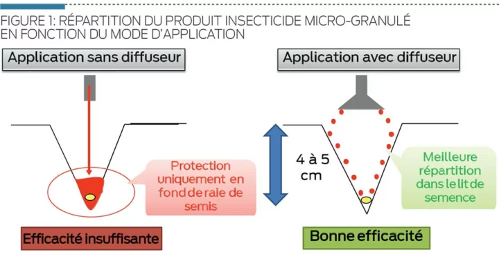Pour obtenir une bonne répartition des microgranulés dans le lit de semences, il faut aussi une bonne préparation du sol et un lit de semence suffisamment humide. En effet, dans un sol sec et motteux (ou en présence de résidus de la culture précédente, de cailloux,…), mal rappuyé, les microgranulés ont tendance à être positionnés en fond de raie de semis ce qui a pour conséquence d’abaisser leur efficacité, notamment dans le cas d’attaque tardive (plutôt localisée au collet de la plante).