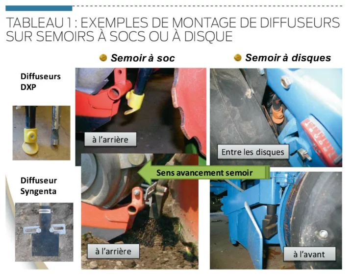 Les substances actives appartenant à la famille des pyréthrinoïdes sont très peu solubles et très peu mobiles dans le sol. Pour être efficaces, les microgranulés devront donc être positionnés lors du semis, de façon homogène sur tout le lit de semence (figure 1). Ceci permettra de protéger correctement la graine, puis le mésocotyle et le collet de la jeune plante de maïs. Pour atteindre cet objectif de bonne répartition, l’installation de diffuseurs sur les descentes du distributeur de microgranulé du semoir est indispensable. Sur les semoirs à socs, le diffuseur se monte à l’arrière, alors que sur les semoirs à disques il doit être monté à l’avant ou au milieu des disques, selon le modèle de diffuseur (tableau 2).