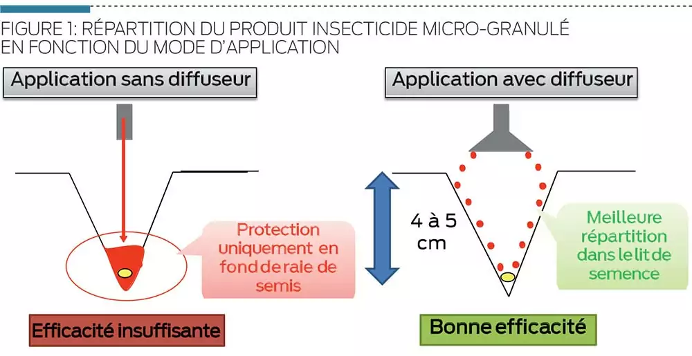 Les substances actives appartenant à la famille des pyréthrinoïdes sont très peu solubles et très peu mobiles dans le sol. Pour être efficaces, les microgranulés devront donc être positionnés lors du semis, de façon homogène sur tout le lit de semence (figure 1). Ceci permettra de protéger correctement la graine, puis le mésocotyle et le collet de la jeune plante de maïs. Pour atteindre cet objectif de bonne répartition, l’installation de diffuseurs sur les descentes du distributeur de microgranulé du semoir est indispensable. Sur les semoirs à socs, le diffuseur se monte à l’arrière, alors que sur les semoirs à disques il doit être monté à l’avant ou au milieu des disques, selon le modèle de diffuseur (tableau 2).