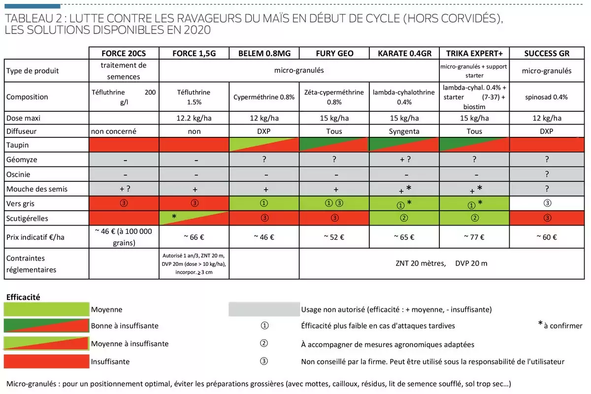 Les produits efficaces contre le taupin sont tous à base de pyréthrinoïdes et sont formulés en microgranulés : Belem 0,8MG/Daxol, Fury Géo, Karaté 0,4GR et Trika Expert+/Trika Lambda 1. Leur prix varient de moins de 50 €/ha à près de 80 €/ha et parmi ces spécialités, seul Belem 0,8 MG / Daxol n’est pas soumis à la contrainte Dispositif Végétalisé Permanent de 20 mètres (tableau 1).Tous ces produits microgranulés doivent être appliqués avec un diffuseur recommandé par la firme. Contre les taupins, ils présentent des niveaux d’efficacité similaires (environ 70 %), à condition de respecter les conditions de mise en œuvre : préparation du lit de semence, humidité du sol, positionnement du diffuseur et d’appliquer la pleine dose. Pour le réglage du distributeur de microgranulés, on se réfèrera au tableau spécifique du matériel utilisé fourni par la firme distributrice du produit. Avant les semis, il est conseillé de réaliser un contrôle à poste fixe de chaque élément, puis de vérifier le bon écoulement du produit au champ.